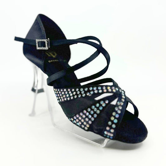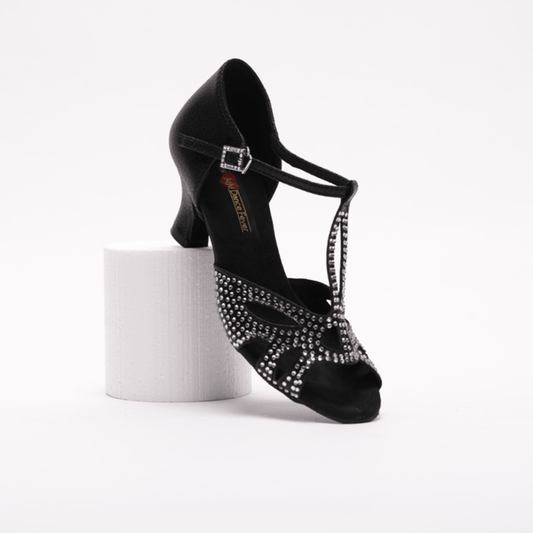 Ladies, Classic, Peep Toe, T-Bar, 2.25 Inch, Spanish Heel, Dance Shoe in Shimmer Black Satin with Silver Rhinestone - (S203B)