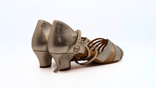 Ladies, Classic, Peep Toe, T-Bar, 2.25 Inch, Spanish Heel, Dance Shoe in Shimmer Gold Satin and Silver Rhinestones - (S203G)