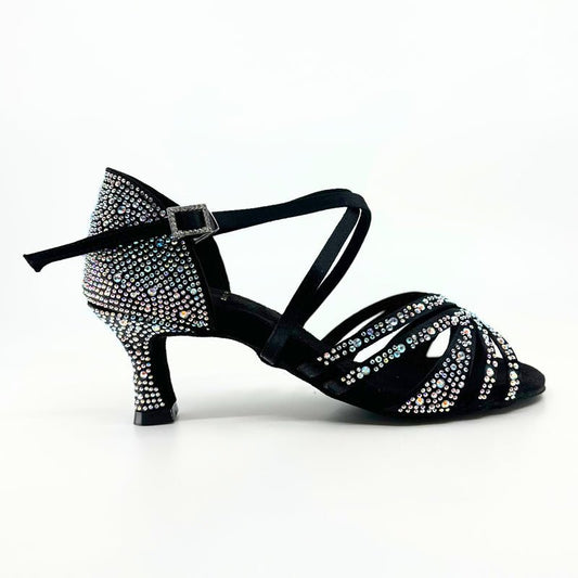 Elegant, Fixed Vamp Strap, 2.25 Inch Flared Heel, 2 Way adjustable Ankle strap, Latin Dance Shoe with AB Rhinestone detailing - (40902T)