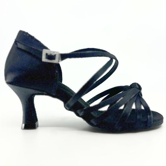 Ladies 3 Inch Heel, 7 Strap Vamp, High Performance Latin Dance Shoe In Black Satin with Suede Sole- (S125BC)