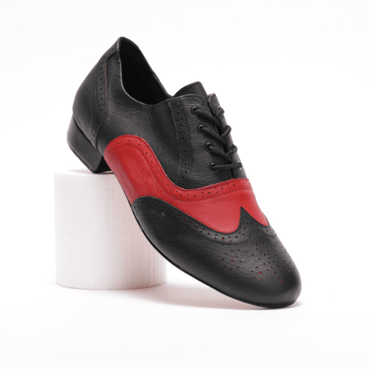 Men's Classic, Brogue, Wingtip In Black And Red Leather With Flat, Smooth, Rubber Sole Dance Shoe - (7817BR)