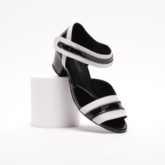 Ladies, Peep Toe, 1.5 Inch Cuban Heel, Velcro Ankle Strap, Dance shoe in Black Patent leather with White Leather trim - (2018BW)