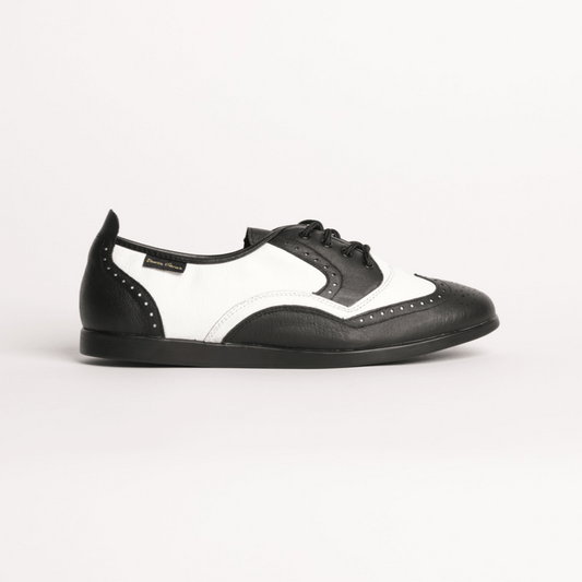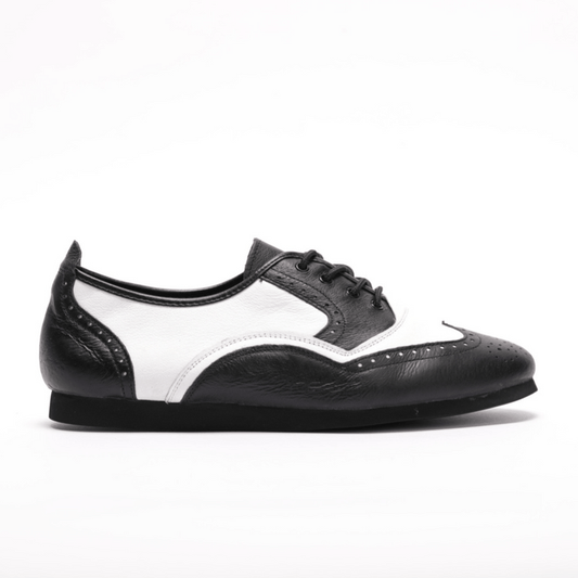 Men's Classic, Brogue, Wingtip In Black And White Leather With Flat, Smooth, Rubber Sole Dance Shoe - (7817BW)